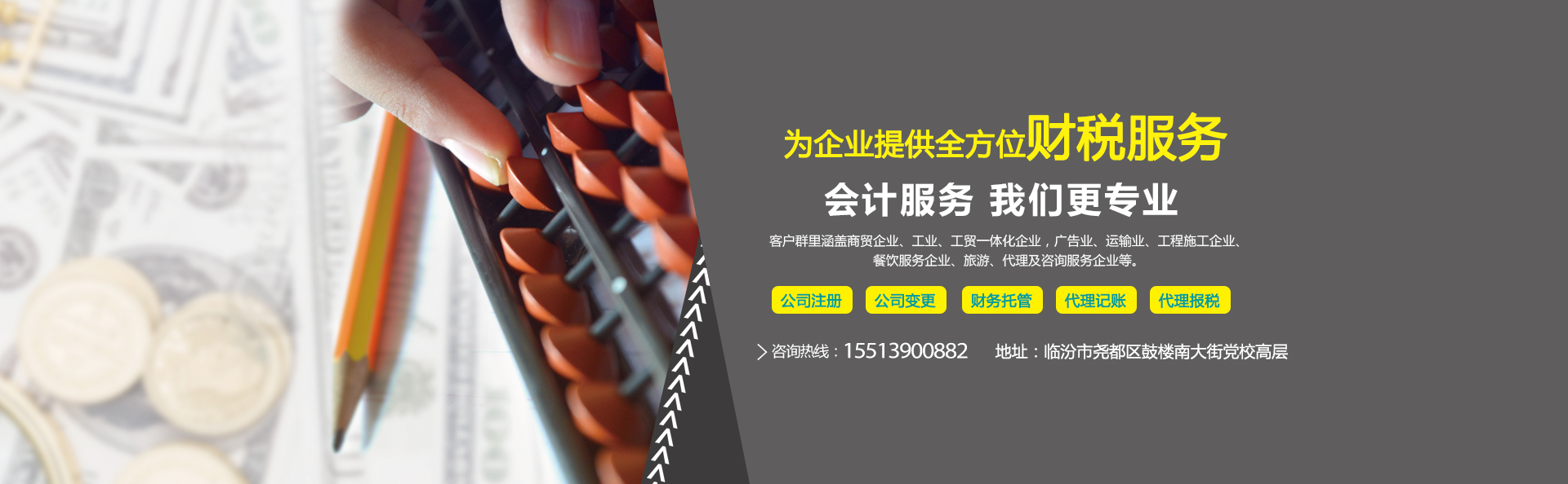 以專業(yè)的業(yè)務(wù)水平和豐富經(jīng)驗(yàn),為企業(yè)進(jìn)行公司注冊(cè)、公司變更、公司注銷、代理記賬、代理報(bào)稅、財(cái)務(wù)托管、財(cái)務(wù)咨詢、商標(biāo)注冊(cè)、驗(yàn)資審計(jì)等服務(wù)。